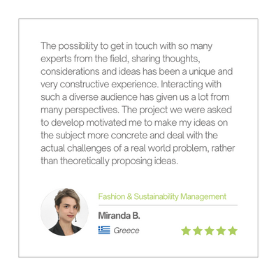 Faculty: you will have the opportunity to interact with leading international experts in sustainable fashion, including brands actively engaged in the topic, United Nations officials, activists, scientists, and NGOs involved in sustainable fashion initiatives.